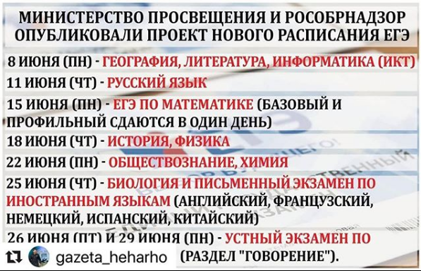 07.04.2020Министерство просвещения и Рособрнадзор опубликовали проект нового расписания Единого государственного экзамена (ЕГЭ) по всем предметам. Документ опубликован на портале проектов нормативных актов в понедельник, 6 апреля.Согласно новому расписанию, первый экзамен у российских одиннадцатиклассников в основной период сдачи пройдет 8 июня. В этот день они напишут ЕГЭ по географии, литературе и информатике. 11 июня состоится обязательный экзамен по русскому языку, 15 июня — по математике (и базовый, и профильный уровень).На 18 июня назначены экзамены по истории и физике, на 22-е — по обществознанию и химии, на 25-е — по иностранным языкам и биологии. Последний экзамен в основной период состоится 29 июня. В этот день выпускники будут сдавать раздел «Говорение», который является частью экзамена по иностранным языкам.Последний резервный день для сдачи ЕГЭ пока запланирован на 11 июля.