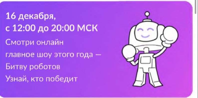 12.12.2023В соответствии с распоряжением Правительства Российской Федерации от 11 апреля 2023 г. N° 889-р при координации Минцифры России ежегодно с 2023 года проводится Международный чемпионат по битве роботов (далее - Чемпионат).Цель Чемпионата - привлечь внимание к современным и перспективным технологиям, востребованным направлениям инженерных наук, стать двигателем робототехнического движения и сформировать у участниковЧемпионатапотребность к получению новых знаний и компетенций.В сентябре и октябре 2023 года прошли два отборочных этапа Чемпионатас участием 58 команд из России, Китая, Турции, Индии и Казахстана.Полуфинал и финал Чемпионата пройдут 16 декабря 2023 г. в г. Москве, в которых примут участие 16 команд из России, Китая, Турции и Индии. Зрителей ждет два шоу (с 11:00 до 20:00 по московскому времени), а также познавательная программа.С учетом высокой социальной значимости Чемпионата и актуальности ранней профориентации школьников в ИТ-сфере Минцифры России просит в срок с 11 по 16 декабря 2023 г. оказать содействие в продвижении Чемпионата и информировании школьников и их родителей посредством размещения информационного баннера (прилагается) со ссылкой на прямую трансляциюЧемпионата в сети «Интернет» по адресу https://vk.com/video-219465931 456239497Bинформационных•системах, используемыхB•учебном процессев общеобразовательных организациях (электронных дневниках и журналах).Принимая во внимание сроки проведения полуфинала и финала Чемпионата, прошу поручить в срок не позднее 11 декабря 2023 г. сообщить в адрес Минцифры России о размещении информации.