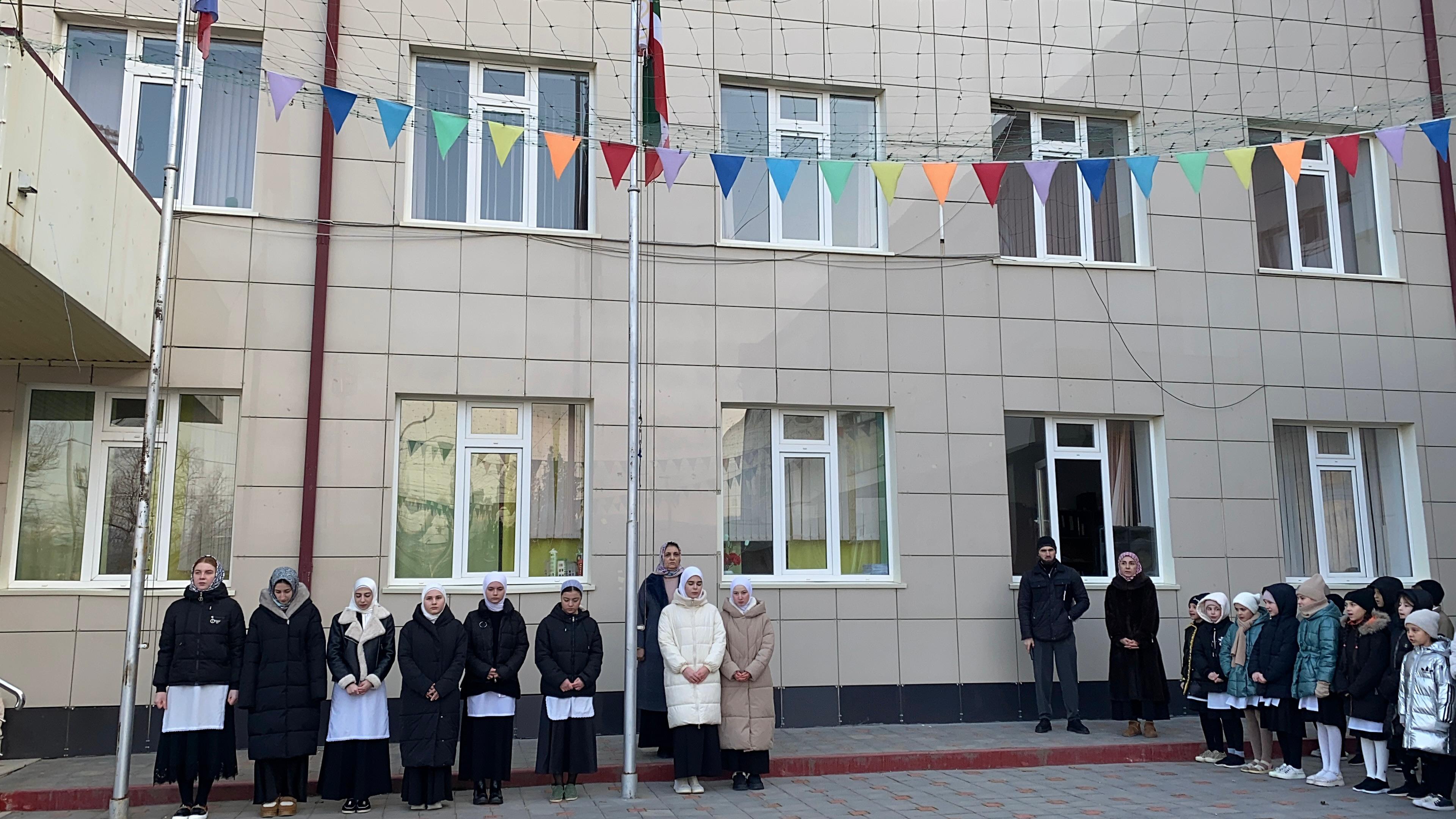 10 февраля 2025 г. по традиции, в понедельник в школе прошла общешкольная линейка с торжественным поднятием флагов, исполнением гимнов Российской Федерации и Чеченской Республики, подведением итогов п