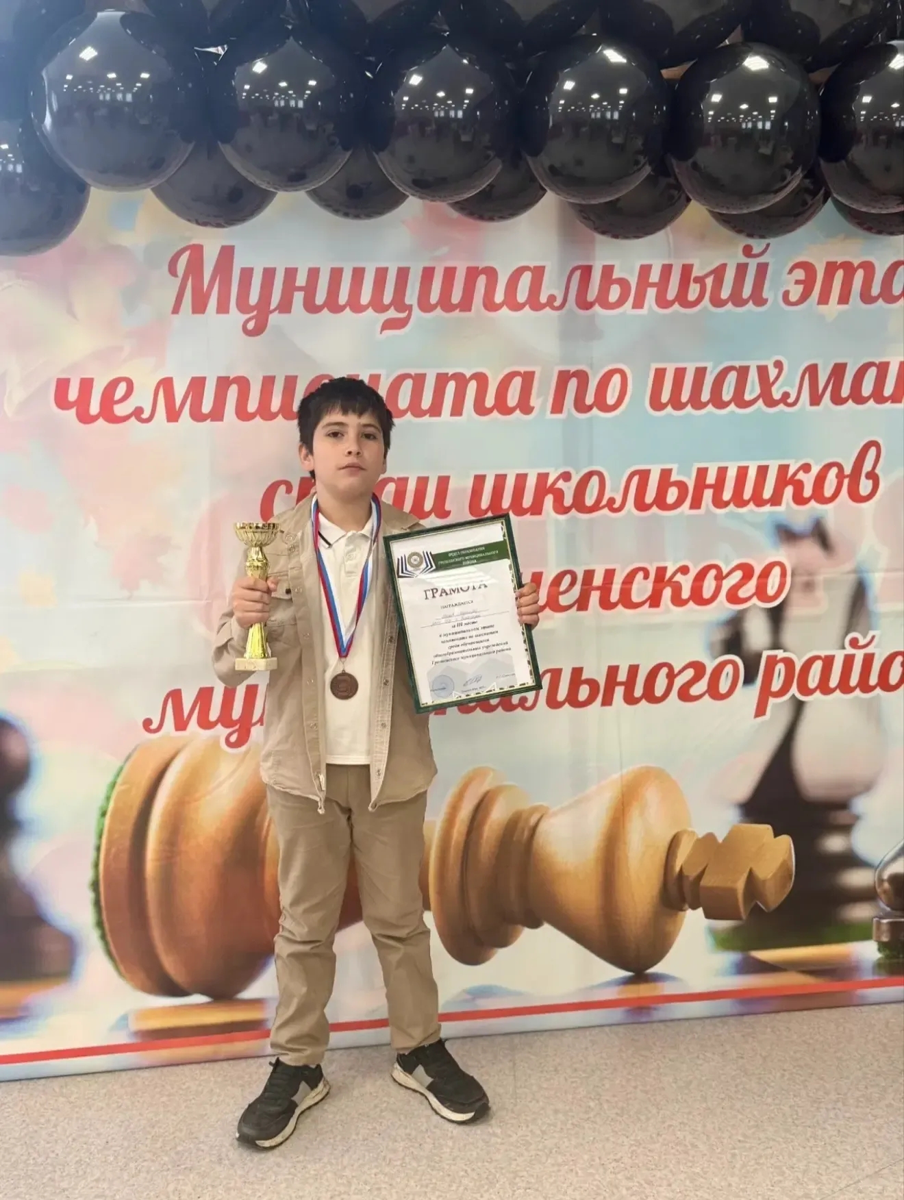 Ученик 6 "А" класса Автаев Мухаммед занял 3-е место на муниципальном этапе чемпионата по шахматам среди обучающихся общеобразовательных учреждений Грозненского района.