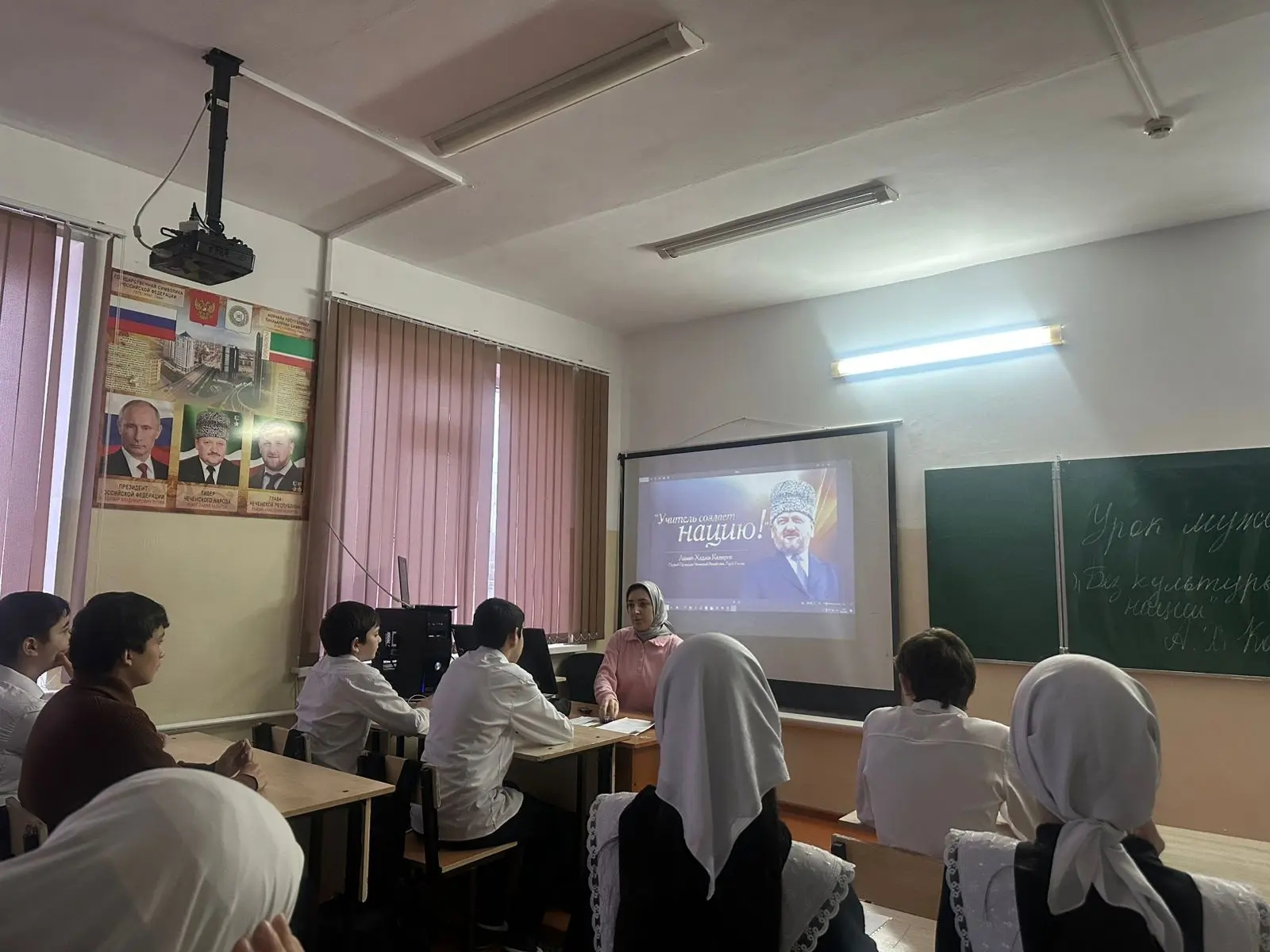 Сегодня в МБОУ "СОШ с.Виноградное " в 9 классах прошли классные часы, в рамках Дня Конституции. Ребята вспомнили заслуги первого президента ЧР, героя России Ахмата-Хаджи Кадырова. Прошло 19 лет со дня официального вступления его в должность. Это событие положило начало мирному процессу, вселился в жителей надежду на достойную жизнь.