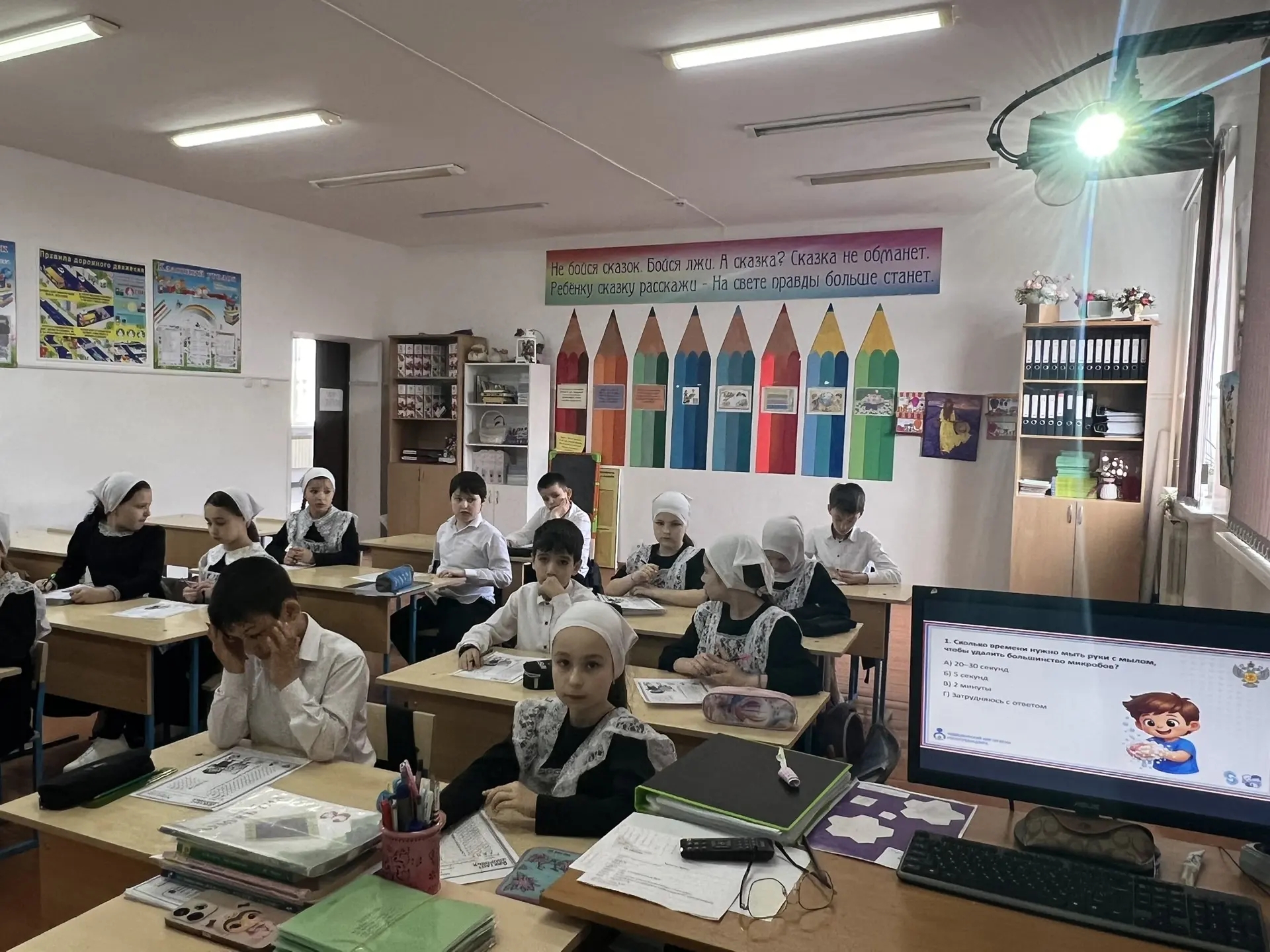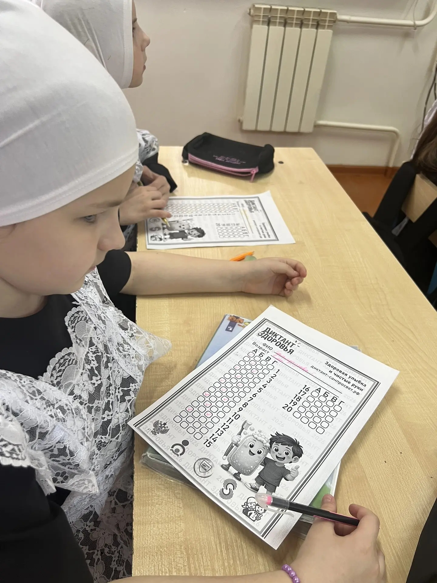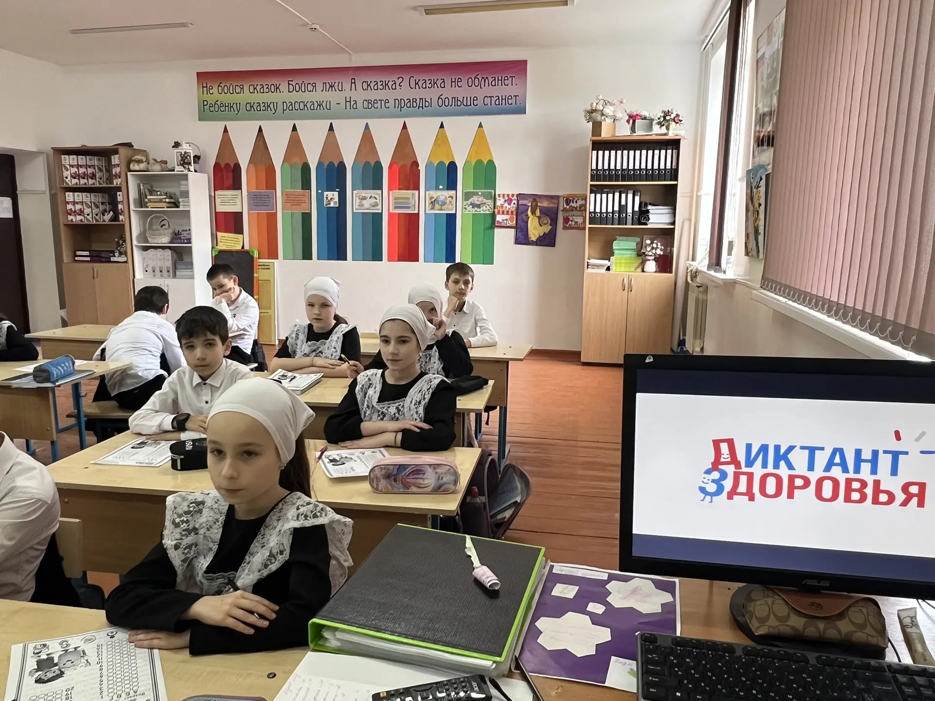 Сегодня эстафету "Диктант здоровья" приняли наши младшие братишки и девченки. Они прошли первый модуль "Здоровая улыбка и чистые руки". Диктант начался в 14.00 и завершился в 14.45 по местному времени. Учитель обратился к ребятам со словами"Здоровье-это не только отсутствие болезней, но и сформированы привычки"